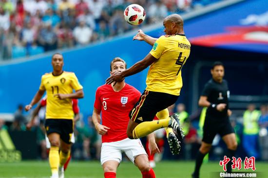 俄罗斯世界杯比利时战胜英格兰获得第三名。图为孔帕尼头球。中新社记者 富田 摄