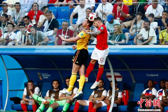 俄罗斯世界杯比利时战胜英格兰获得第三名。图为维尔通亨和特里皮尔争顶。中新社记者 富田 摄