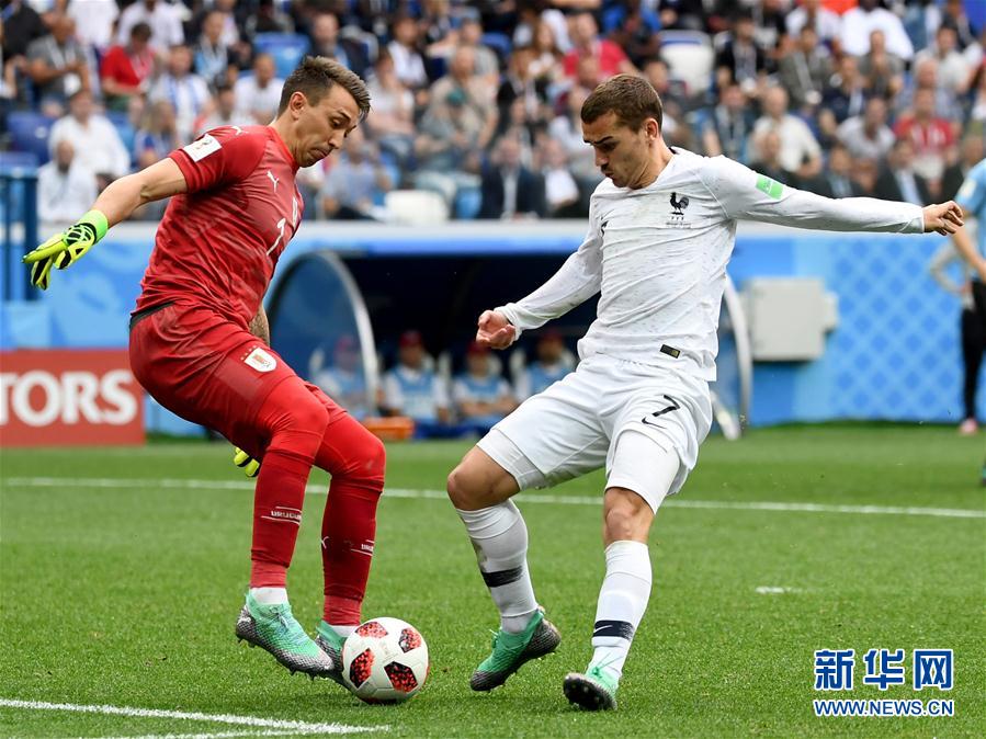 1998年,法国队在本土进行的世界杯足球赛上夺得了球队历史上的首个世界杯冠军。随后的四届世界杯比赛中,“高卢雄鸡”四度出击,力争第二座冠军奖杯,却屡屡铩羽而归。2018年,距离法国队上一次捧起大力神杯已足足过去20年,当年以队长身份捧杯的德尚如今已成为球队的主教练。这一次法国队没有重复在2006年与冠军奖杯擦肩而过的遗憾,决赛中力克克罗地亚队,终于将久违的大力神杯带回法国。图为7月6日,法国队球员格列兹曼(右)与乌拉圭队守门员穆斯莱拉在比赛中拼抢。当日,法国队在2018俄罗斯世界杯足球赛四分之一决赛中以2比0战胜乌拉圭队,晋级四强。新华社记者陈诚摄