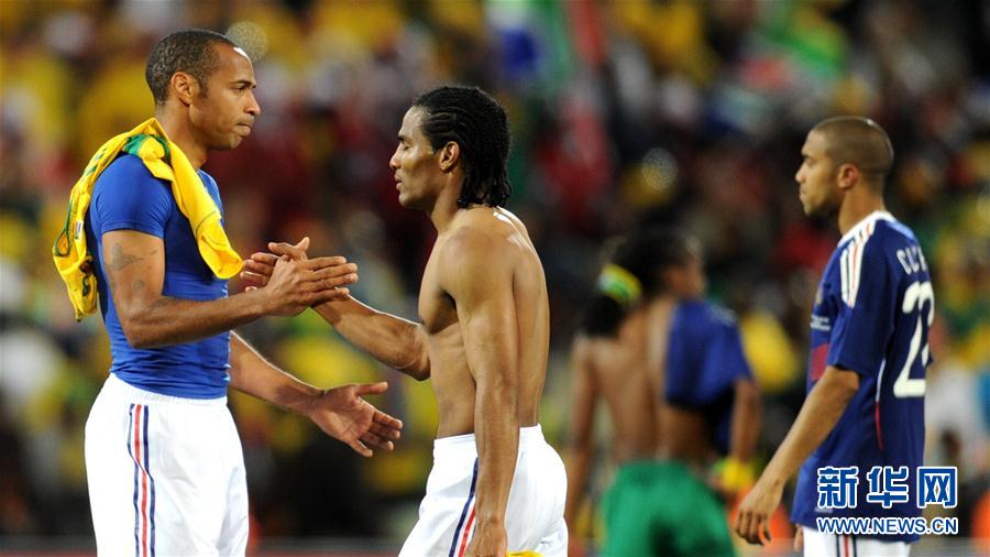 1998年,法国队在本土进行的世界杯足球赛上夺得了球队历史上的首个世界杯冠军。随后的四届世界杯比赛中,“高卢雄鸡”四度出击,力争第二座冠军奖杯,却屡屡铩羽而归。2018年,距离法国队上一次捧起大力神杯已足足过去20年,当年以队长身份捧杯的德尚如今已成为球队的主教练。这一次法国队没有重复在2006年与冠军奖杯擦肩而过的遗憾,决赛中力克克罗地亚队,终于将久违的大力神杯带回法国。图为在2010年南非世界杯对阵南非队的比赛后,法国队球员亨利(左)与队友马卢达(左二)握手(2010年6月22日摄)。当日,法国队以1比2不敌东道主南非队,以小组垫底的惨淡战绩告别世界杯。新华社记者李尕摄