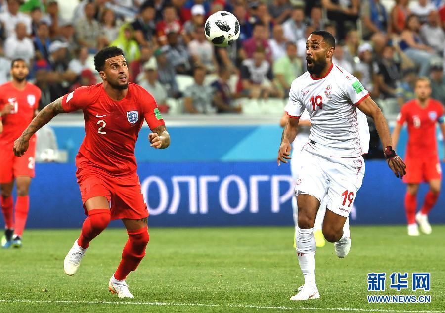 6月18日,英格兰队球员沃克(左)与突尼斯队球员哈利法在比赛中拼抢。当日,在伏尔加格勒进行的2018俄罗斯世界杯足球赛G组小组赛中,英格兰队以2比1战胜突尼斯队。 新华社记者陈诚摄