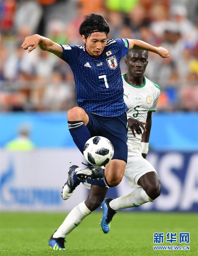 6月24日,日本队球员柴崎岳(左)在比赛中控球。当日,在叶卡捷琳堡进行的2018俄罗斯世界杯足球赛H组小组赛中,日本队以2比2战平塞内加尔队。 新华社记者刘大伟摄