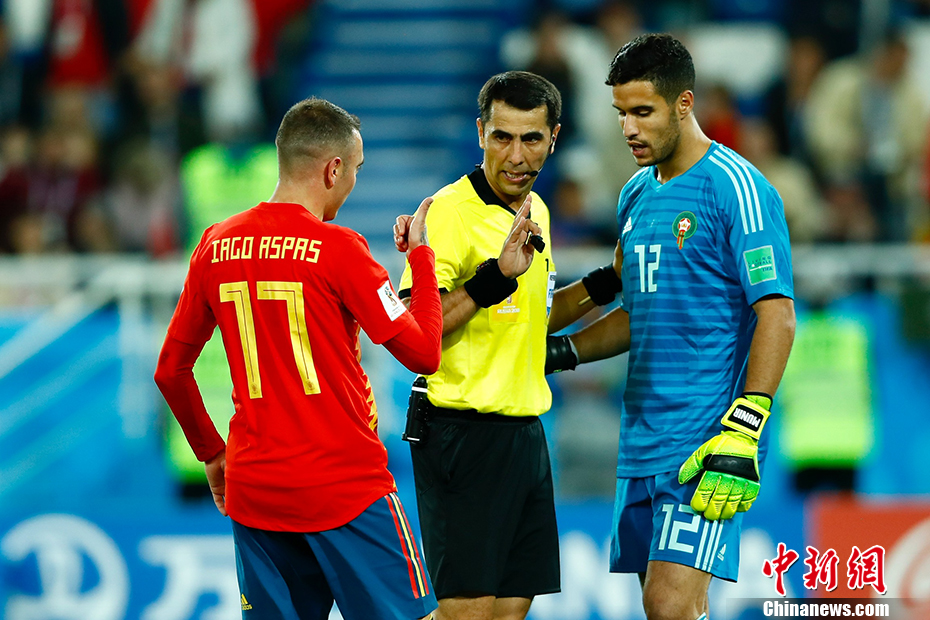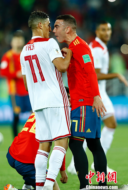北京时间6月26日凌晨,俄罗斯世界杯B组小组赛打响收官之战,西班牙面对已经提前出局的摩洛哥并没能讨得什么便宜,两度在落后的情况下两度扳平,最终2-2与对手握手言和。西班牙1胜2平,凭借进球优势力压葡萄牙,以小组第一的身份出线。 中新社记者 富田 摄