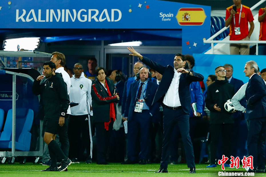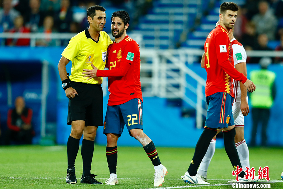 北京时间6月26日凌晨,俄罗斯世界杯B组小组赛打响收官之战,西班牙面对已经提前出局的摩洛哥并没能讨得什么便宜,两度在落后的情况下两度扳平,最终2-2与对手握手言和。西班牙1胜2平,凭借进球优势力压葡萄牙,以小组第一的身份出线。 中新社记者 富田 摄