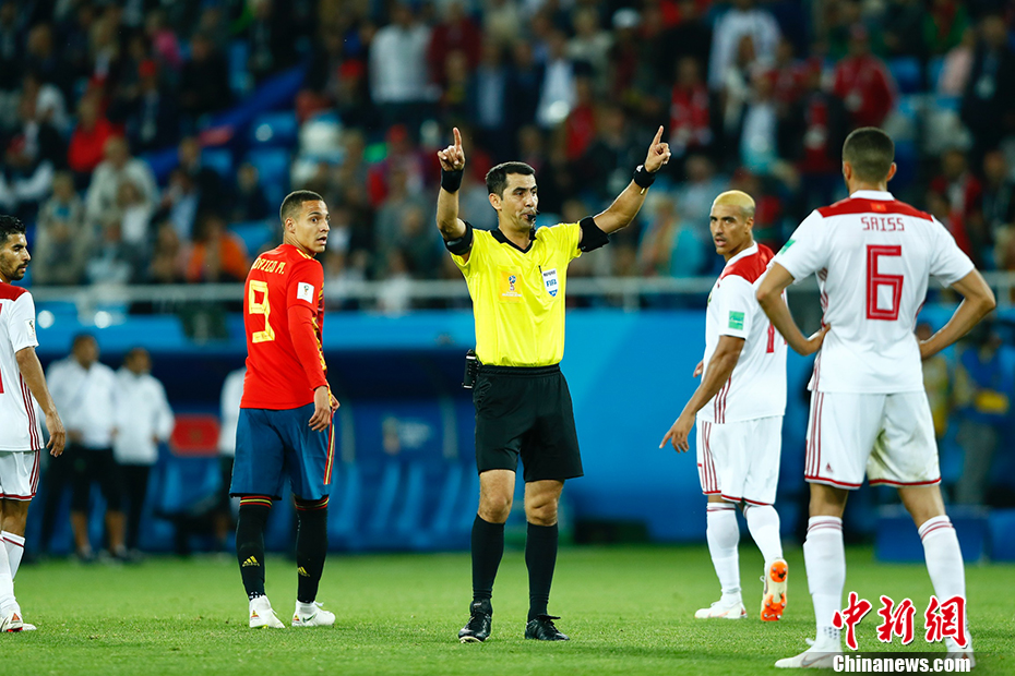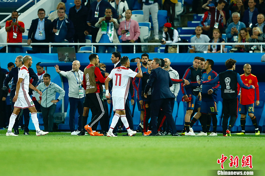 北京时间6月26日凌晨,俄罗斯世界杯B组小组赛打响收官之战,西班牙面对已经提前出局的摩洛哥并没能讨得什么便宜,两度在落后的情况下两度扳平,最终2-2与对手握手言和。西班牙1胜2平,凭借进球优势力压葡萄牙,以小组第一的身份出线。 中新社记者 富田 摄