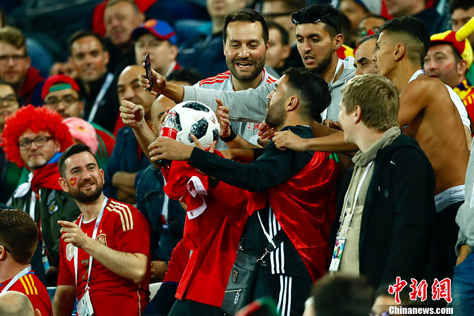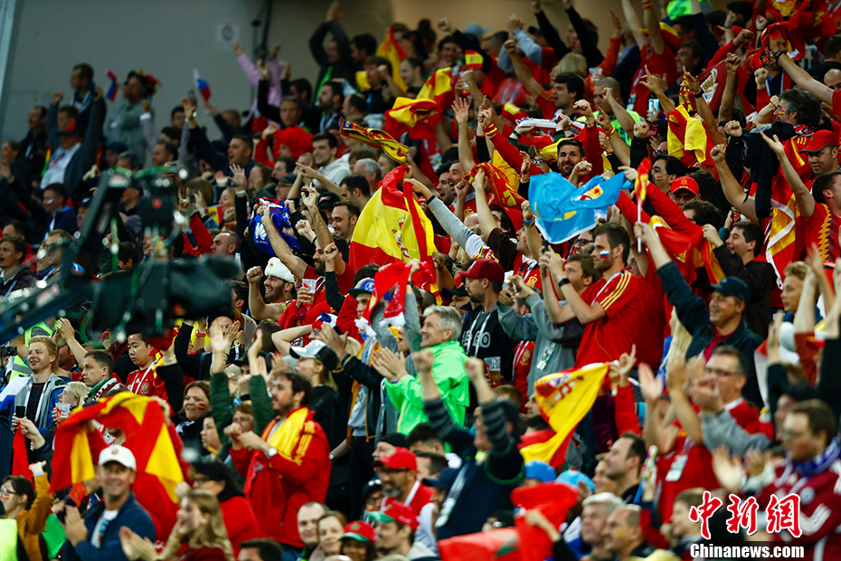 北京时间6月26日凌晨,俄罗斯世界杯B组小组赛打响收官之战,西班牙面对已经提前出局的摩洛哥并没能讨得什么便宜,两度在落后的情况下两度扳平,最终2-2与对手握手言和。西班牙1胜2平,凭借进球优势力压葡萄牙,以小组第一的身份出线。图为看台上的西班牙球迷。 中新社记者 富田 摄