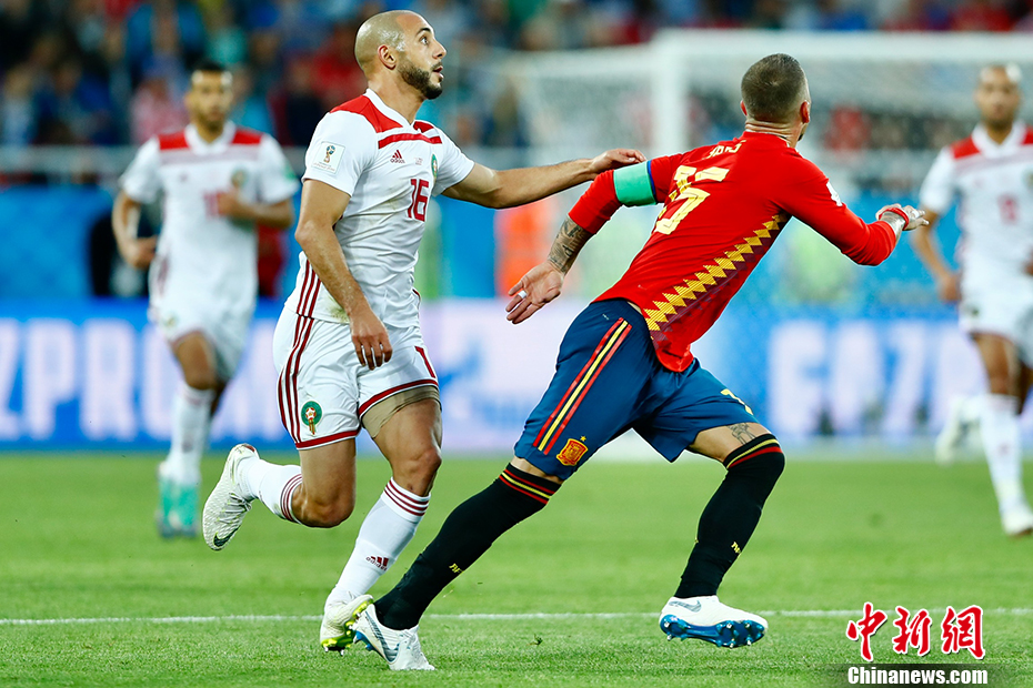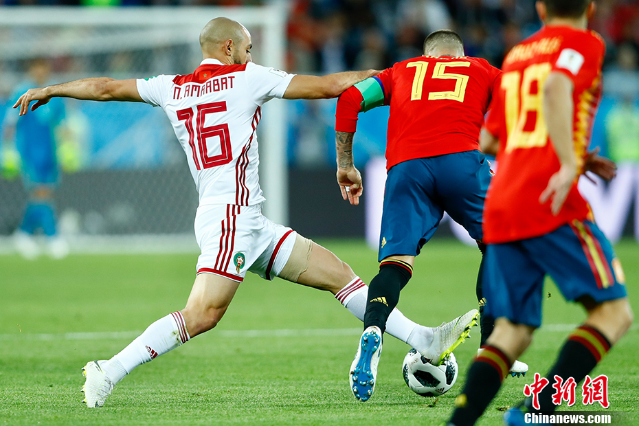 双方易地再战,摩洛哥再次让前世界杯冠军队领教了自己的实力。第80分钟摩洛哥传中打在了皮克手上,但裁判考虑到没有扩大防区并未吹罚点球,摩洛哥队获得了全场比赛第一个角球,内斯里高高跃起头槌破门,帮助球队再次领先。 中新社记者 富田 摄