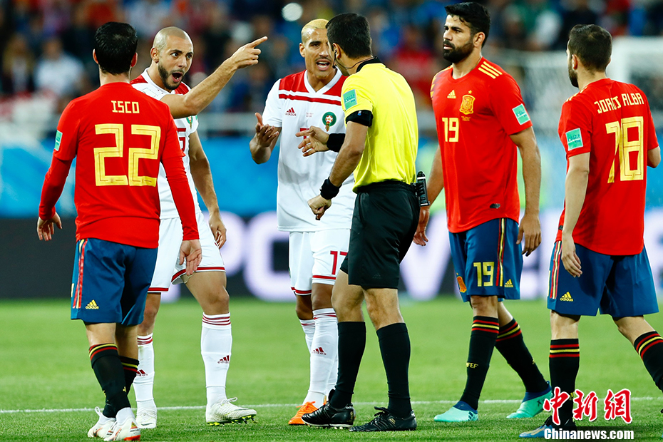 比分落后的西班牙随即展开大举进攻,并由阿斯帕斯在补时阶段攻入一球,裁判最初认定此球越位在先、进球无效。但经过VAR视频裁判回看后改判进球有效。最终双方2-2握手言和。 中新社记者 富田 摄
