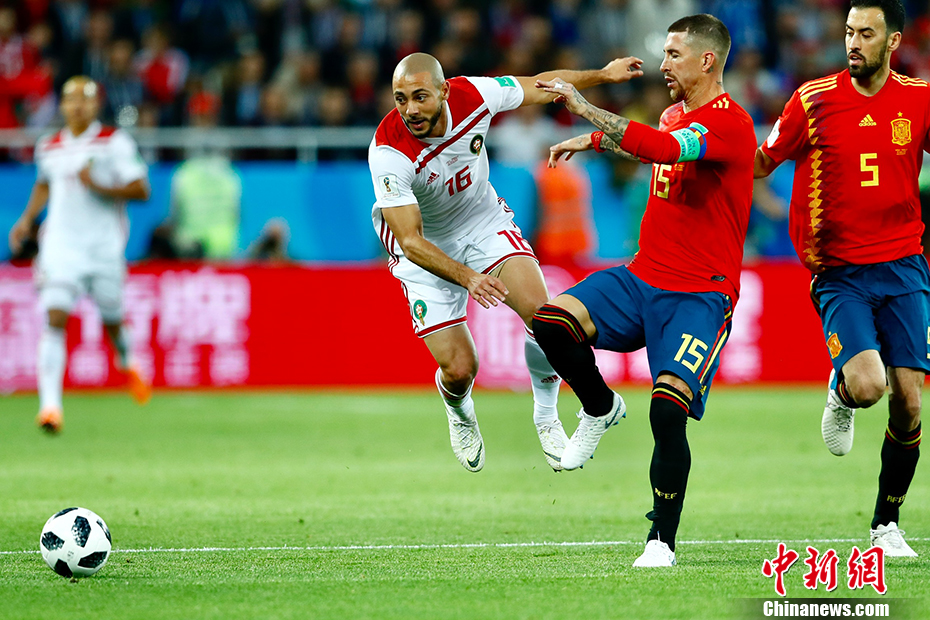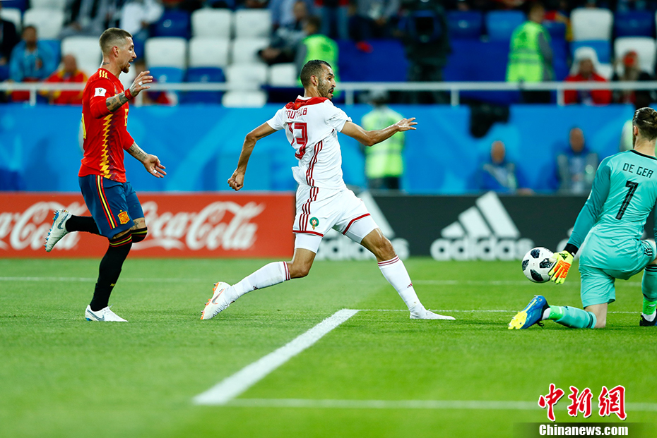 北京时间6月26日凌晨,俄罗斯世界杯B组小组赛打响收官之战,西班牙面对已经提前出局的摩洛哥并没能讨得什么便宜,两度在落后的情况下两度扳平,最终2-2与对手握手言和。西班牙1胜2平,凭借进球优势力压葡萄牙,以小组第一的身份出线。图为布塔伊卜射门。 中新社记者 富田 摄