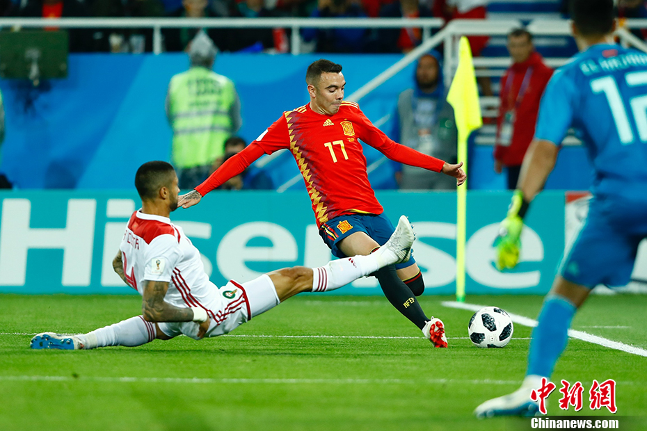 北京时间6月26日凌晨,俄罗斯世界杯B组小组赛打响收官之战,西班牙面对已经提前出局的摩洛哥并没能讨得什么便宜,两度在落后的情况下两度扳平,最终2-2与对手握手言和。西班牙1胜2平,凭借进球优势力压葡萄牙,以小组第一的身份出线。 中新社记者 富田 摄