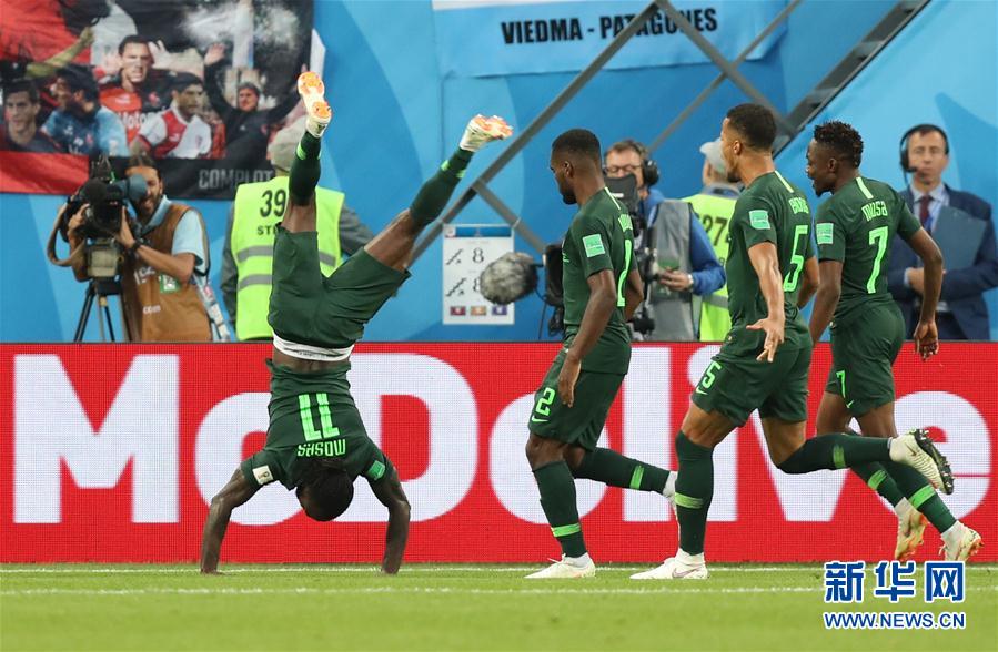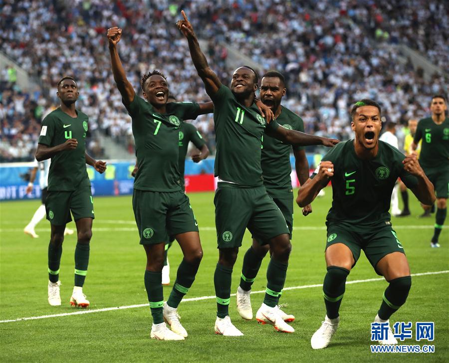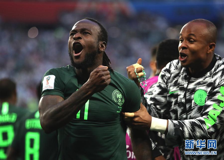 6月26日,尼日利亚队球员维·摩西(左)在比赛中庆祝进球。当日,在圣彼得堡进行的2018俄罗斯世界杯足球赛D组小组赛中,阿根廷队以2比1战胜尼日利亚队,晋级十六强。 新华社记者吴壮摄