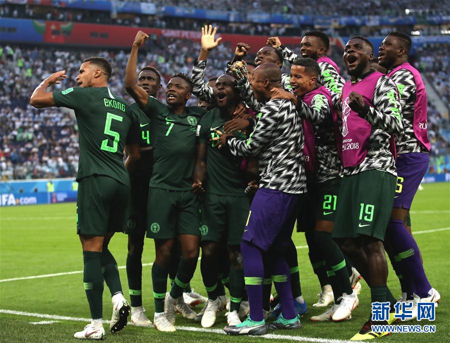 6月26日,尼日利亚队球员维·摩西(中)在比赛中与队友庆祝进球。当日,在圣彼得堡进行的2018俄罗斯世界杯足球赛D组小组赛中,阿根廷队以2比1战胜尼日利亚队,晋级十六强。 新华社记者吴壮摄