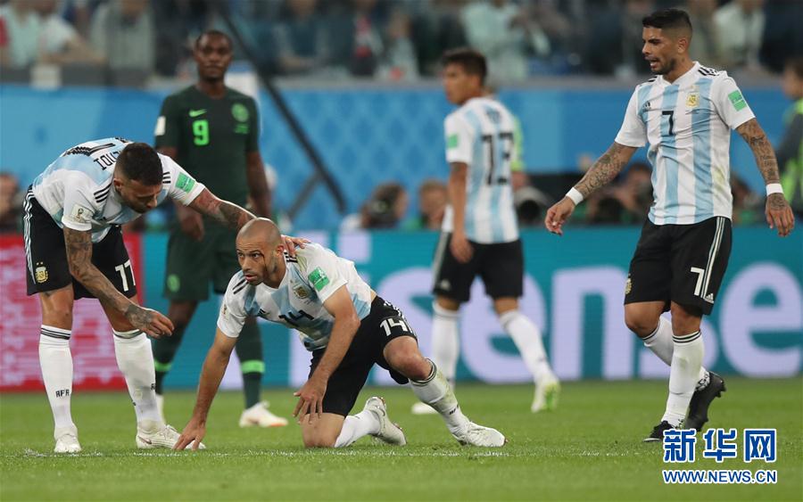 6月26日,阿根廷队球员马斯切拉诺(中)在比赛中。当日,在圣彼得堡进行的2018俄罗斯世界杯足球赛D组小组赛中,阿根廷队以2比1战胜尼日利亚队,晋级十六强。 新华社记者吴壮摄