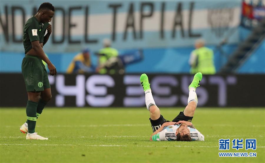 6月26日,阿根廷队球员梅西(右)在赛后躺在球场上。当日,在圣彼得堡进行的2018俄罗斯世界杯足球赛D组小组赛中,阿根廷队以2比1战胜尼日利亚队,晋级十六强。 新华社记者杨磊摄