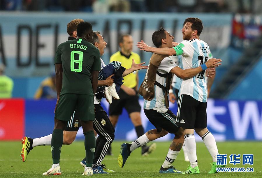 6月26日,阿根廷队球员赛后庆祝晋级。当日,在圣彼得堡进行的2018俄罗斯世界杯足球赛D组小组赛中,阿根廷队以2比1战胜尼日利亚队,晋级十六强。 新华社记者杨磊摄