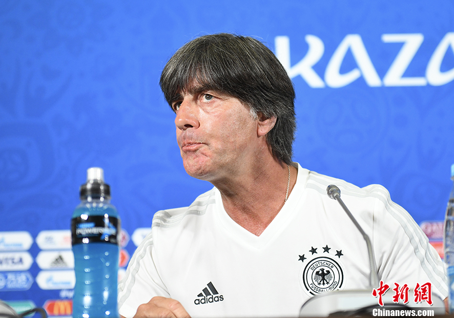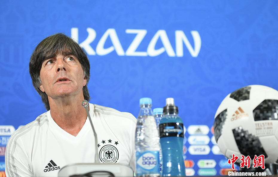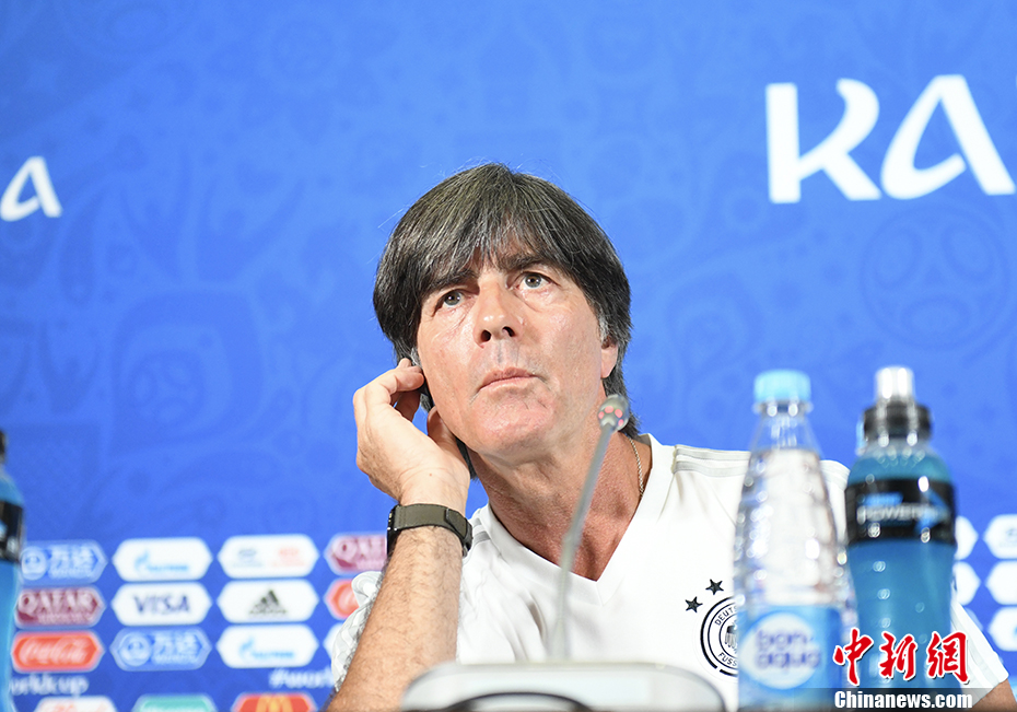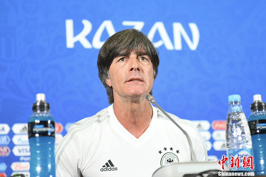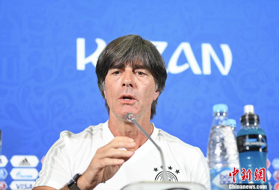 当地时间6月26日,德国队主帅勒夫在喀山体育场亮相赛前发布会。由于德国队此前一胜一负,因此接下来对阵韩国的比赛极为关键。 中新社记者 田博川 摄