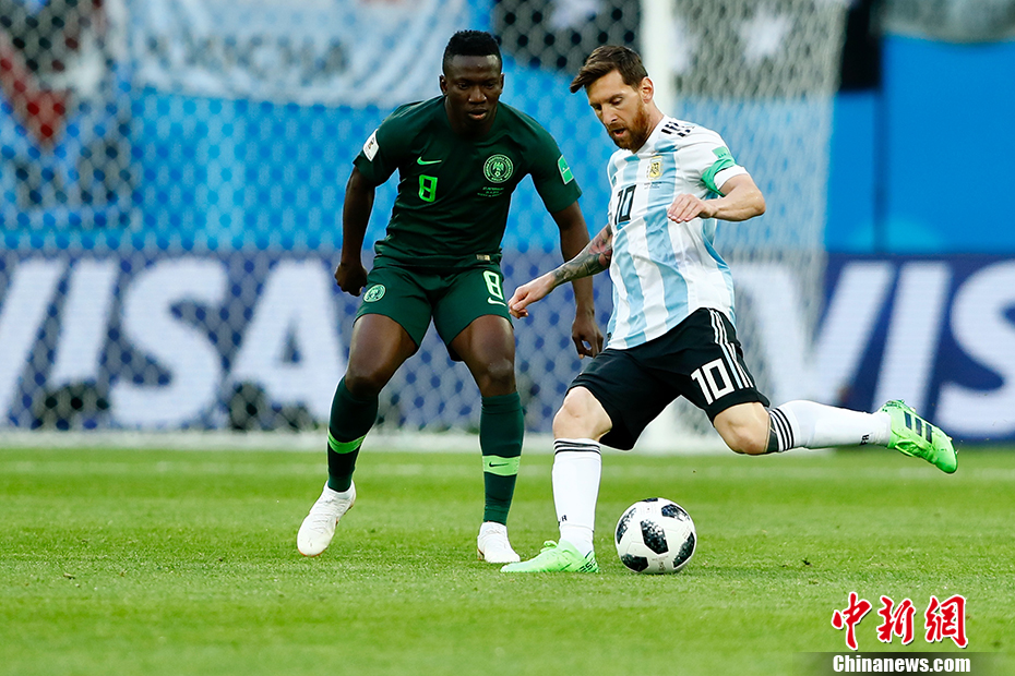 北京时间6月27日凌晨,2018俄罗斯世界杯D组阿根廷与尼日利亚的“生死战”在圣彼得堡新泽尼特体育场打响。梅西、罗霍建功,阿根廷队2-1战胜尼日利亚。在D组同时进行的另一场比赛中,克罗地亚2-1战胜冰岛,克罗地亚、阿根廷分列D组第一第二晋级16强。阿根廷将与C组第一法国队争夺一个8强席位。 中新社记者 富田 摄