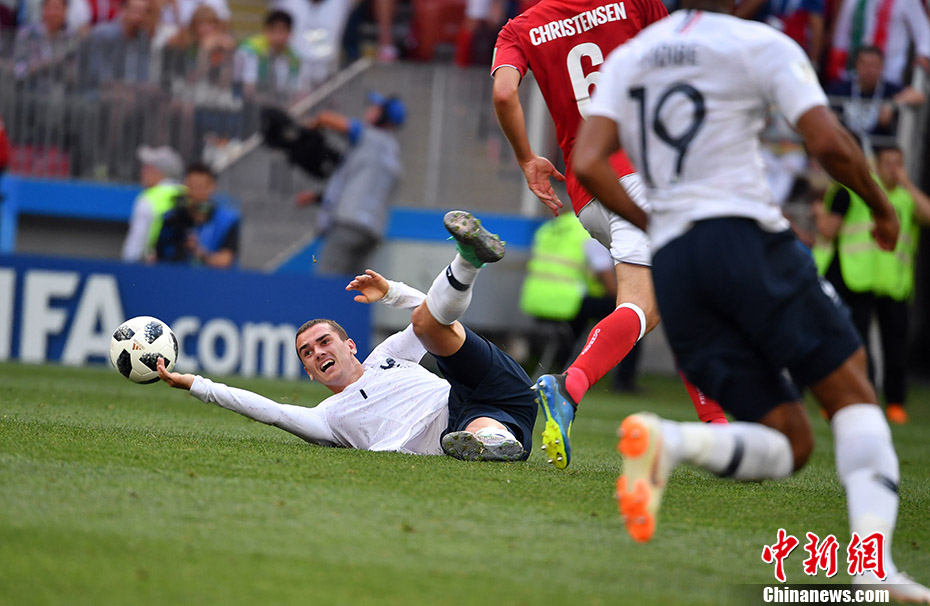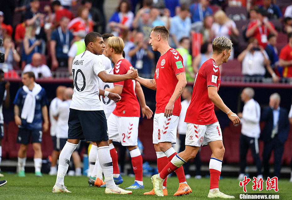 北京时间6月26日晚,2018俄罗斯世界杯C组丹麦与法国的比赛在莫斯科卢日尼基体育场打响。本场比赛,两支球队打平即可携手出线,在同时进行的另外一场比赛中,秘鲁2-0战胜澳大利亚。最终,丹麦队0-0闷平法国,法国队以小组第一出线,将在接下来的比赛中对阵D组第二。丹麦队小组第二出线,在接下来的比赛中对阵实力强劲的“格子军团”克罗地亚。 中新社记者 毛建军 摄