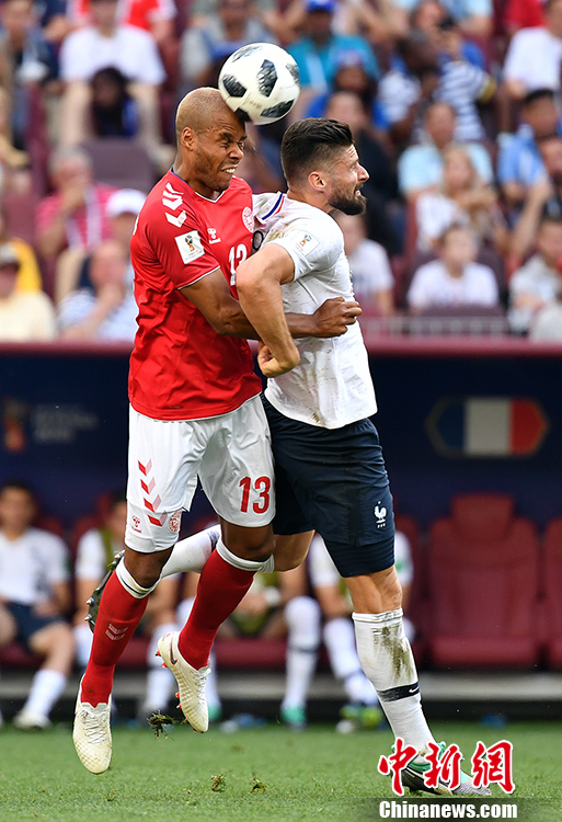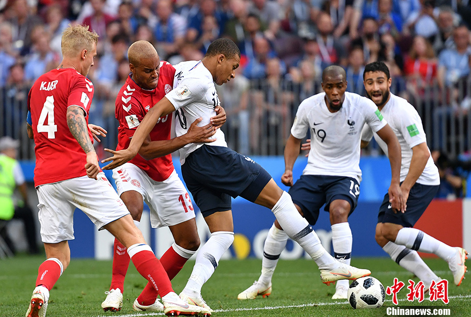 北京时间6月26日晚,2018俄罗斯世界杯C组丹麦与法国的比赛在莫斯科卢日尼基体育场打响。本场比赛,两支球队打平即可携手出线,在同时进行的另外一场比赛中,秘鲁2-0战胜澳大利亚。最终,丹麦队0-0闷平法国,法国队以小组第一出线,将在接下来的比赛中对阵D组第二。丹麦队小组第二出线,在接下来的比赛中对阵实力强劲的“格子军团”克罗地亚。 中新社记者 毛建军 摄