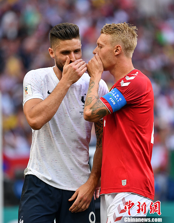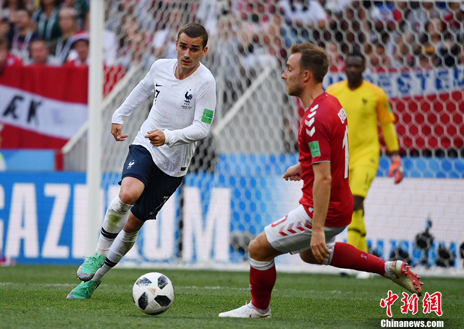 北京时间6月26日晚,2018俄罗斯世界杯C组丹麦与法国的比赛在莫斯科卢日尼基体育场打响。本场比赛,两支球队打平即可携手出线,在同时进行的另外一场比赛中,秘鲁2-0战胜澳大利亚。最终,丹麦队0-0闷平法国,法国队以小组第一出线,将在接下来的比赛中对阵D组第二。丹麦队小组第二出线,在接下来的比赛中对阵实力强劲的“格子军团”克罗地亚。 中新社记者 毛建军 摄