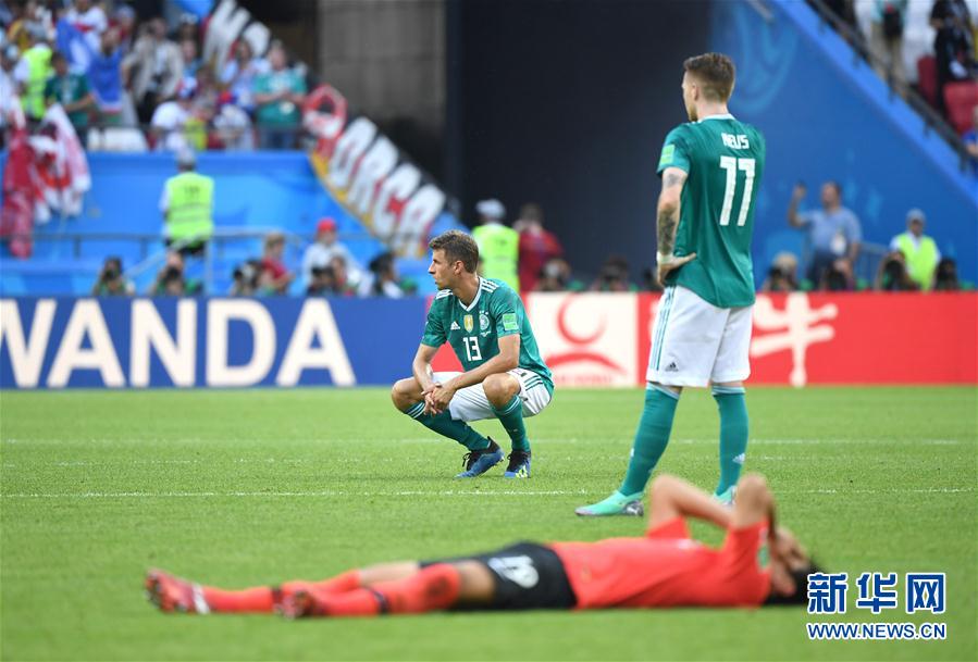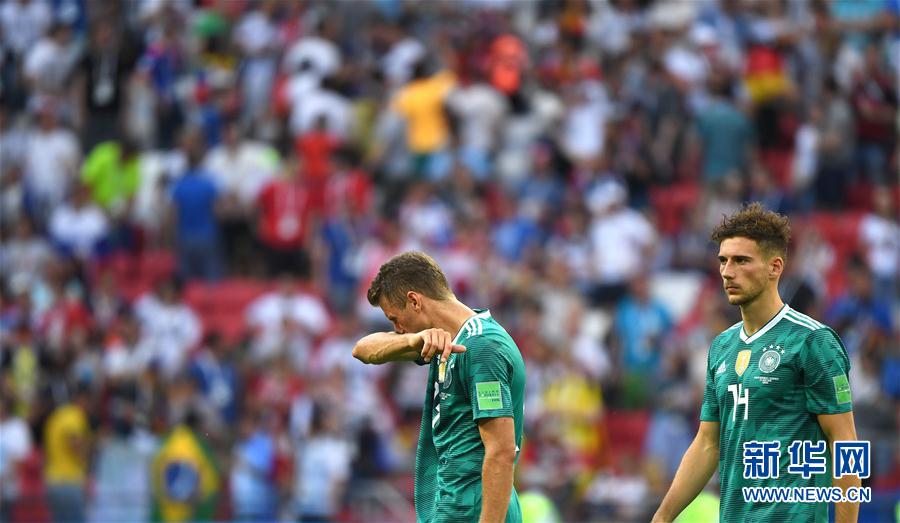 6月27日,德国队球员穆勒(上左)在赛后神情沮丧。当日,在喀山进行的2018俄罗斯世界杯足球赛F组小组赛中,德国队以0比2不敌韩国队,位列小组第四,遭淘汰。 新华社记者李尕摄