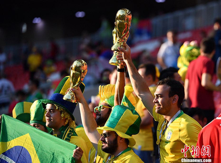 巴西球迷手捧“大力神杯”。 中新社记者 毛建军 摄
