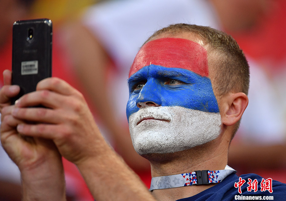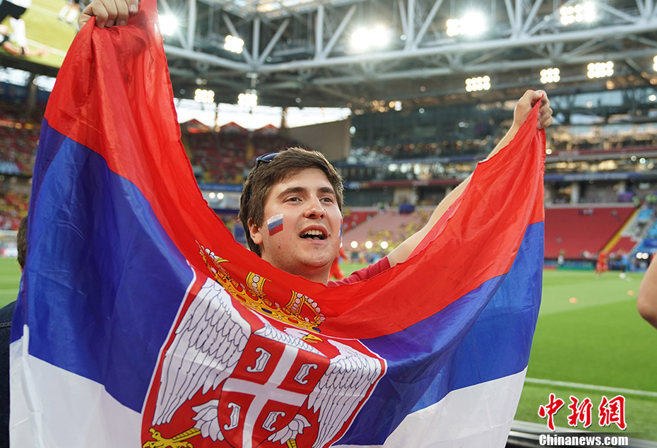 一位塞尔维亚球迷在赛场。 中新社记者 毛建军 摄