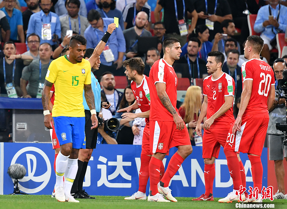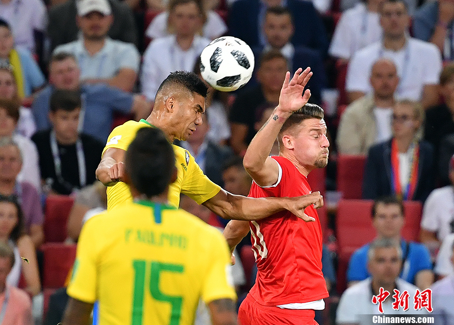 下半场易边再战,第48分钟,塞尔维亚队马蒂奇铲倒热苏斯吃到黄牌。第56分钟,塞尔维亚队获得绝佳机会,利亚伊奇一脚弧线球直奔球门远角,巴西队后卫米兰达禁区内惊险解围。 中新社记者 毛建军 摄