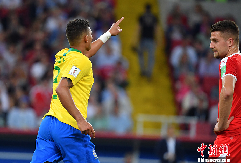 两粒进球领先的巴西队踢的越来越放松,在塞尔维亚半场形成攻防演练,最终裁判哨响,全场比赛结束,“桑巴军团”以华丽的进攻,流畅的传导,2-0完胜塞尔维亚。 中新社记者 毛建军 摄