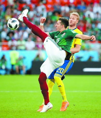 比赛伊始,瑞典队目的明确,每个定位球都在对方门前利用身高优势制造威胁。扛住瑞典队开场三板斧后,墨西哥队渐入佳境,但贝拉、埃雷拉等人的射门相继被瑞典队门将奥尔森扑出。第29分钟,“小豌豆”埃尔南德斯在本方禁区内手球,瑞典队众将强烈抗议,但裁判观看视频回放后只判罚了角球。