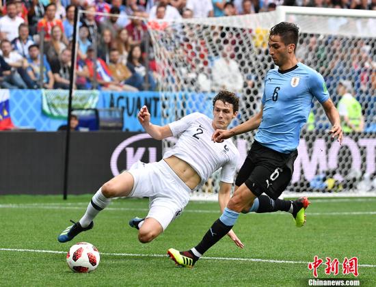 北京时间7月6日晚22:00,俄罗斯世界杯第一场1/4决赛在下诺夫哥罗德球场率先打响,凭借着格里兹曼的一传一射和瓦拉内的进球,法国队以2:0战胜乌拉圭队,晋级四强。中新社记者 毛建军 摄