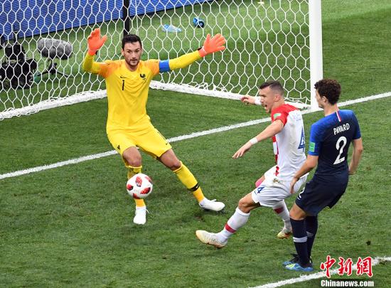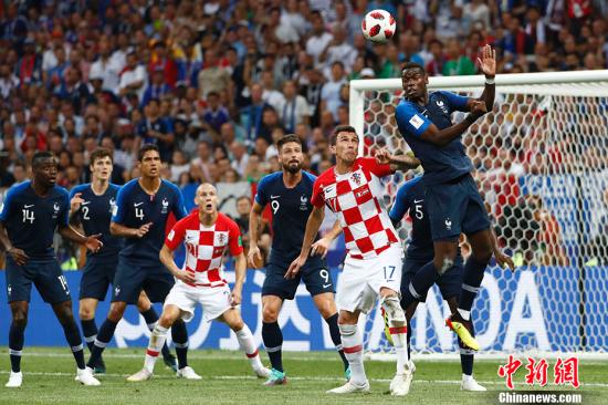 第33分钟,法国队获得角球机会,马图伊迪前点头球一蹭,球打在佩里西奇的手上弹出底线。主裁判观看视频助理裁判(VAR)系统后判定点球,这也是世界杯决赛史上第一个由VAR系统判定的点球。格列兹曼主罚命中,法国队由此扭转场上局势。