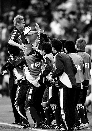 北京时间昨天凌晨,日本队2比2战平塞内加尔队。本田圭佑攻入扳平比分的关键一球,从而实现连续三届世界杯均有进球,总进球数达到4个,成为世界杯历史上进球最多的亚洲球员。图为本田圭佑(上)在进球后与队友庆祝。新华社发