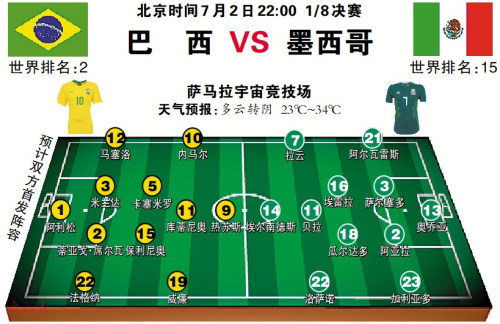 巴西和墨西哥都是连续7次晋级世界杯16强,这是两队第5次在世界杯相遇,此前4次巴西3胜1平保持不败,打进11球,一球不失。“桑巴军团”本届世界杯的目标自然是冠军,希望弥补2014年的遗憾,最好还能“复仇”4年前打了自己7比1的德国,没想到卫冕冠军第一场比赛就倒在了墨西哥的脚下,所以,“桑巴军团”就把墨西哥当成德国来踢好了。