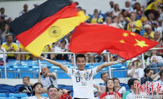 6月24日,俄罗斯索契,来自中国广东的球迷小黄在观看2018俄罗斯世界杯德国队比赛时,挥舞中国和德国国旗。
