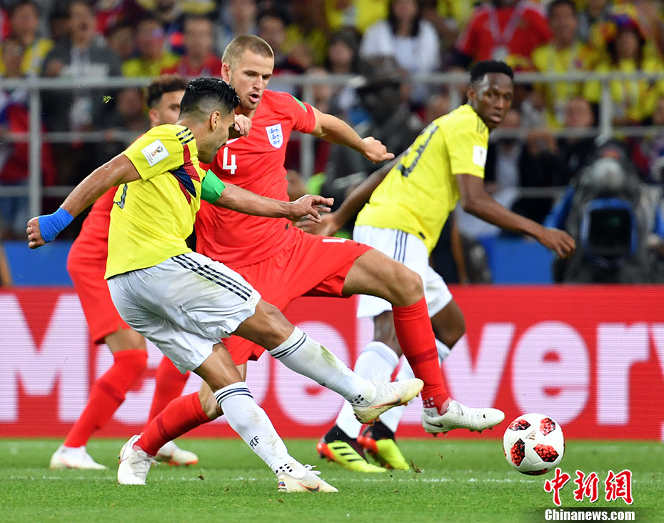 在莫斯科进行的2018俄罗斯世界杯足球赛八分之一决赛中,哥伦比亚队对阵英格兰队。