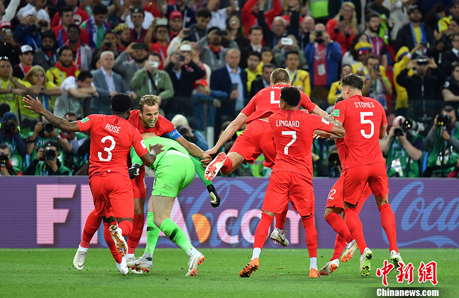 点球大战第一轮,法尔考和凯恩的点球分别命中;随后夸德拉多和拉什福德同样再次命中,前两轮双方打成2:2;第三轮穆里尔将球罚进,但是亨德森的射门却被哥伦比亚门将扑出;第四轮哥伦比亚队乌里贝的射门打在横梁上弹出,特里皮尔将球罚进,两队战成4:4;最后一轮巴卡的射门被门将扑出,英格兰队戴尔命中,最终英格兰点球大战4:3战胜对手,总比分5:4艰难晋级八强。 中新社记者 毛建军 摄