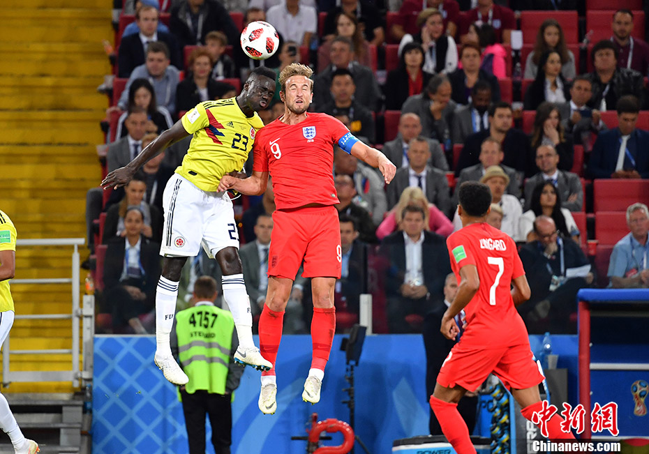 在莫斯科进行的2018俄罗斯世界杯足球赛八分之一决赛中,哥伦比亚队对阵英格兰队。