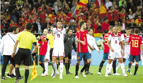 西班牙与摩洛哥队的小组上出现的争议场面,靠VAR技术得到解决。新华社发