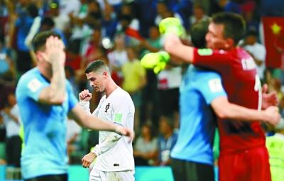 本场比赛虽是葡、乌两队在世界杯上首度碰面,但双方阵中有多名球员曾经或正在西甲联赛踢球,因而对彼此的特点都比较熟悉。赛前,场内的乌拉圭球迷高唱着《长空一色》,点燃了现场的气氛,也鼓舞着乌拉圭队全力争胜。众所周知,要想击败葡萄牙队,必须防住C罗。实战中,乌拉圭队不仅成功“控制”了C罗,而且教练组对比赛形势的预判、临场换人的拿捏也都十分精准。考虑到后卫吉梅内斯伤愈复出,乌拉圭队老帅塔瓦雷斯排出442阵型,在后卫线上加强防守力量,制定了防守反击的战术思路。比赛中,乌拉圭队退防迅速,一旦在防守中断球,马上起大脚,把球传给前锋苏亚雷斯。该队第7分钟的进球,正是缘于快速反击当中苏亚雷斯和另一前锋卡瓦尼之间的默契配合。当时卡瓦尼在本方右路得球,然后直接起大脚传向左路的苏亚雷斯,后者接球后稍作调整,再次起球传向远点,包抄到小禁区的卡瓦尼头球破门。