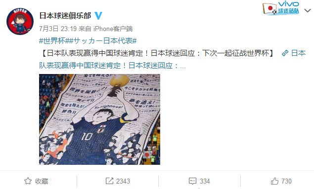 7月3日深夜,@日本球迷俱乐部 发微博称,日本队表现赢得中国球迷肯定!日本球迷回应:下次一起征战世界杯。
