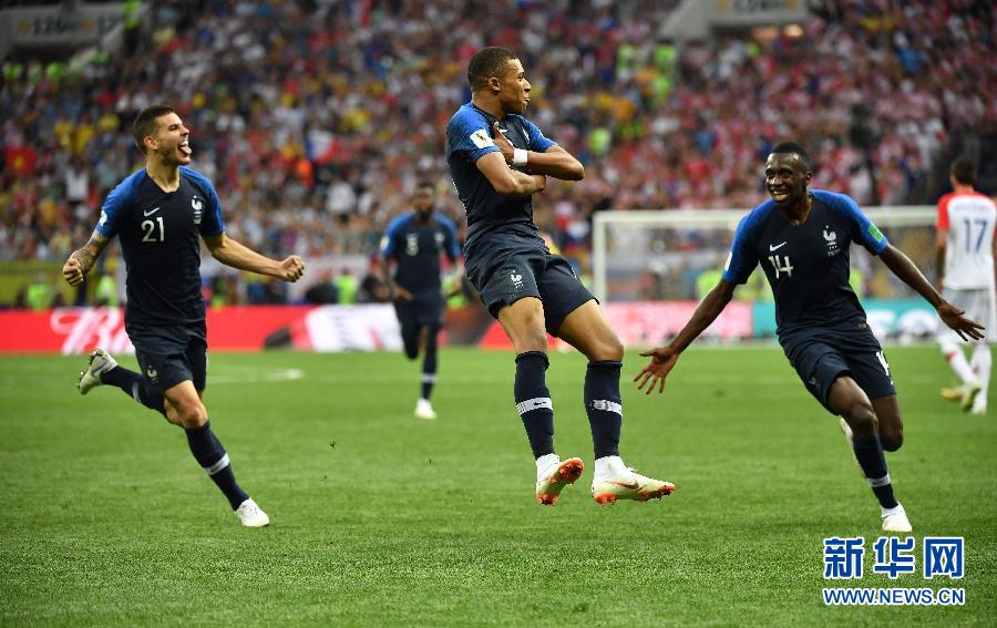 新华社莫斯科7月15日电(记者韦骅7月15日,法国队球员姆巴佩(前中)在比赛中庆祝进球。当日,在莫斯科进行的2018俄罗斯世界杯足球赛决赛中,法国队以4比2战胜克罗地亚队,继1998年后再夺世界杯冠军。 新华社记者李尕摄、苏斌、岳东兴)莫斯科的瓢泼大雨中,法国队队长洛里在莫斯科卢日尼基体育场近8万名观众的注视下,捧起了那座令无数球队魂牵梦绕的大力神杯。整整20年后,“高卢雄鸡”与金杯再度完成了“牵手”。