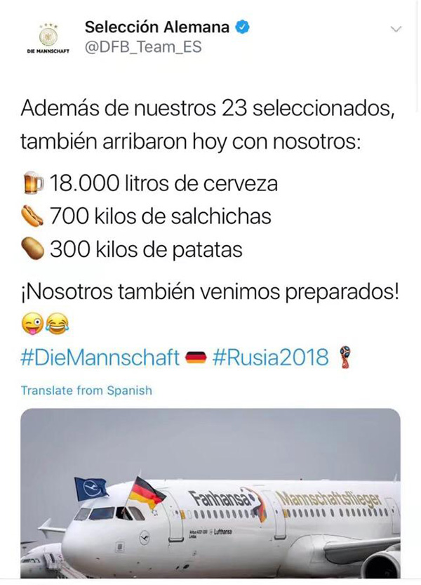 德国队抵达莫斯科时,与他们一同到达的还有近18吨的食材,这其中包括18000升啤酒。