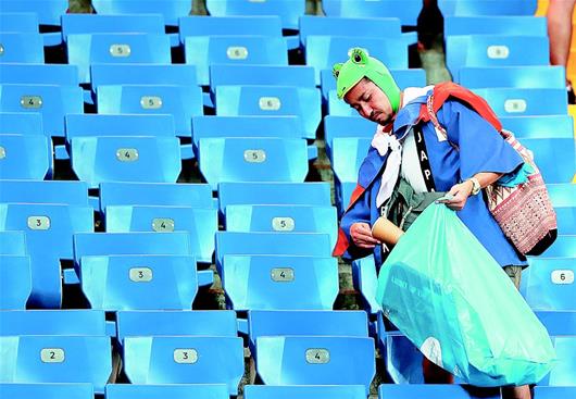 图为:日本球迷赛后主动清理看台垃圾。(新华社发)