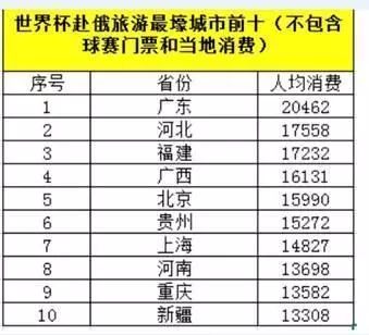 而从旅游产品的人均费用看,世界杯期间消费最高的出发省(市、自治区)分别是广东、河北、福建、广西、北京、贵州、上海、河南、重庆、新疆。