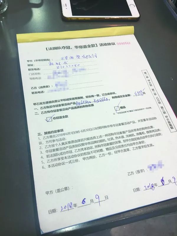 店员从抽屉里拿出了一本厚厚的标有“法国队夺冠,华帝退全款”活动协议字样的本子,介绍说,消费者可以参加“夺冠退全款”的活动,但不感兴趣的客户可以放弃这一权益,换得其他赠品。