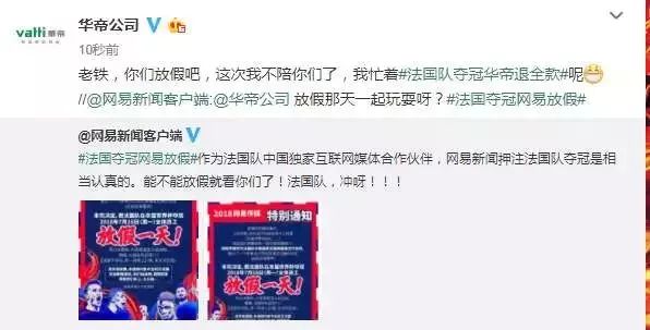 邮件中提到:网易传媒作为法国队中国独家互联网媒体合作伙伴,如果法国队在世界杯夺冠,则2018年7月16日(周一),全体员工放假一天。当然,尽管法国队实力强劲,但足球场上什么都有可能发生,如果法国队最终没有夺冠,则周一的班照常上。