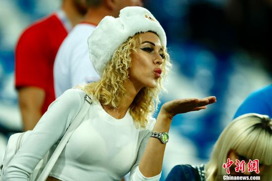 俄罗斯世界杯比赛看台上一位女球迷。中新社记者 田博川 摄