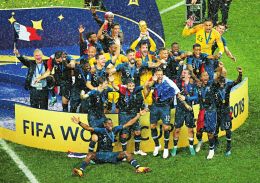 7月15日,在莫斯科进行的2018俄罗斯世界杯足球赛决赛中,法国队以4:2战胜克罗地亚队,继1998年后再夺世界杯冠军。图为法国队球员在颁奖仪式上庆祝。 新华社发