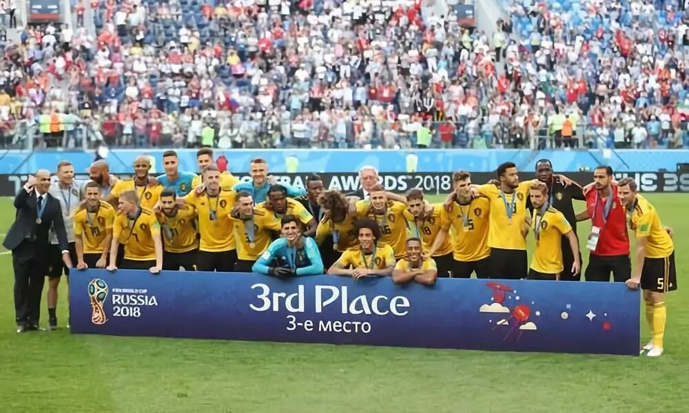 7月14日,比利时队夺得世界杯季军,在颁奖仪式上庆祝。新华社记者费茂华摄